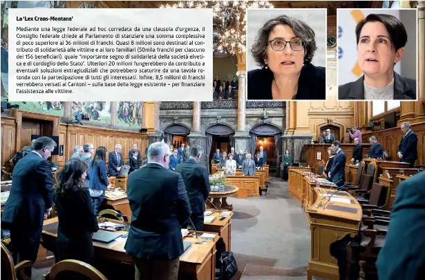 La Commissione degli affari giuridici del Consiglio degli Stati (Cag-S) ha esaminato il disegno di legge tra lunedì e martedì mattina. Raccomanda al plenum (con un solo voto contrario) di entrare in materia. Approva l’idea di accordare un contributo straordinario di solidarietà e di istituire una tavola rotonda, giacché crede opportuno esprimere “in modo più visibile la solidarietà e la vicinanza della popolazione svizzera alle vittime (...) e ai loro familiari”. Afferma però di comprendere “le preoccupazioni espresse da più parti”. In effetti, recita una nota dei servizi parlamentari, questo “intervento inusuale da parte della Confederazione (...) può apparire ingiusto nei confronti delle vittime di altre tragedie e pone questioni di principio sotto il profilo dell’uguaglianza giuridica”. La commissione propone pertanto di riconoscere alla Confederazione un diritto di regresso nei confronti dei responsabili del danno e di terzi civilmente responsabili, così da permetterle all’occorrenza di rivalersi su di essi. Inoltre, si vuole approfondire nel quadro della procedura legislativa ordinaria in quale misura e a quali condizioni la Confederazione possa contribuire, in via sussidiaria, al finanziamento di eventuali transazioni derivanti da eventuali accordi amichevoli discussi durante la tavola rotonda. Il plenum ne discuterà stamane. Lunedì sarà il turno del Nazionale. Il tempo stringe. La legge, limitata alla fine del 2029, va dichiarata urgente in questa sessione affinché il contributo di solidarietà possa essere versato ancora questa primavera.