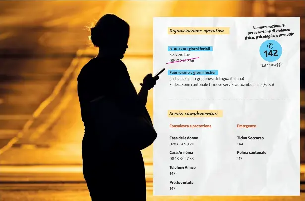 Ma di cosa si tratta? Concretamente dal 1° maggio il 142 sarà un numero nazionale dedicato alle vittime di violenza fisica, psicologica e sessuale, ma anche alle persone loro vicine e ai testimoni. Un servizio gratuito, attivo 24 ore su 24 e sette giorni su sette. Ma attenzione: esattamente come il 143 del Telefono Amico o il 147 di Pro Juventute, il 142 non è un numero di emergenza. Pur essendo un numero a tre cifre, non prevede la geolocalizzazione delle chiamate e non consente l’invio diretto di servizi di pronto intervento come accade invece allertando il 144. Insomma, in caso di bisogno di aiuto immediato e urgente, gli enti di primo soccorso, in particolare polizia e autoambulanze, devono essere contattati direttamente tramite i numeri specifici. Più precisamente, come spiegato dalla collaboratrice scientifica sul tema della violenza domestica presso il Servizio per l’aiuto alle vittime di reati (Lav) Kim Savoy, la risposta alle chiamate al 142 sarà garantita durante gli orari d’ufficio – quindi dalle 8.30 alle 17 – dallo stesso Servizio Lav: il sostegno comprende una consulenza specializzata e un accompagnamento da parte di operatrici qualificate. «A tale scopo – indica Savoy – è previsto un potenziamento del Servizio Lav che in questo momento risponde allo 0800 866 866 (numero che da maggio verrà appunto sostituito dal 142, ndr) durante gli orari dell’Amministrazione cantonale, ovvero dalle 8.45 alle 11.45 e dalle 14 alle 16». Fuori orario e nei giorni festivi la risposta sarà invece assicurata dal personale della Federazione cantonale ticinese servizi autoambulanze (Fctsa), che già si occupa di gestire la centrale di allarme e coordinamento sanitario Ticino Soccorso 144. Per assumere questo compito, aggiunge ancora Savoy, «anche il personale della Fctsa è stato potenziato attraverso una formazione specifica degli operatori che dovranno rispondere al 142». La nuova offerta, va detto, è complementare dato che non va a sostituire i numeri di emergenza o i servizi di ascolto già attivi (vedi infografica).